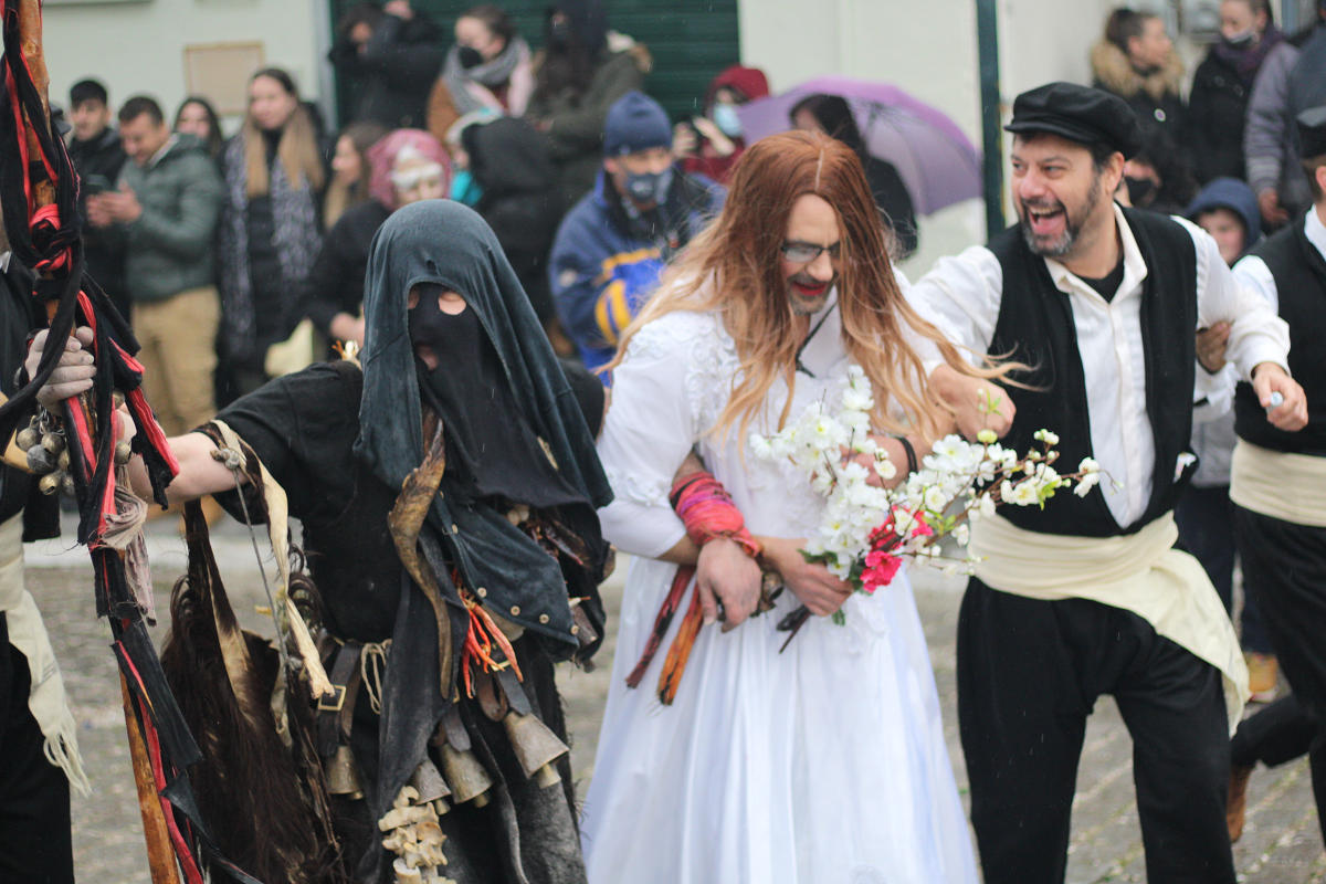 Το έθιμο κορυφώνεται στις 8 Ιανουαρίου με την αναπαράσταση του παρωδία γάμου. Σε αυτή τη γιορτή μεταμφιεσμένων κυριαρχεί ο αυθορμητισμός και ο ενθουσιασμός. Σε γενικές γραμμές ο εικονικός γάμος ακολουθεί το τυπικό του παραδοσιακού γάμου υπό τους ήχους των τοπικών παραδοσιακών οργάνων, της γκάιντας και του νταχαρέ. Δηλαδή, ντύσιμο γαμπρού, νύφης, εικονικός ιερέας, τέλεση μυστηρίου στην πλατεία του χωριού, τα προικιά της νύφης φορτωμένα σε άλογα, συμβουλές και πειράγματα σεξουαλικού περιεχομένου κ.α. Τη νύφη υποδύεται πάντα άνδρας, λόγω της θέσης που είχε η γυναίκα κατά την αρχαιότητα, αλλά και για να ενισχύσει την κωμικότητα του δρωμένου. Οι Μπαμπούγεροι μετά την τέλεση του μυστηρίου, κλέβουν τη νύφη από τον γαμπρό και αφού υποτίθεται τη γονιμοποιήσουν, την επιστρέφουν πίσω.